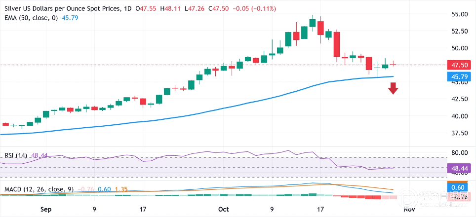 周四亚洲交易时段,白银试图突破48.00美元,并吸引了一些空头。然而,白银成功守住了周二触及的9月25日以来的最低水平,目前略低于47.00美元,当日下跌0.20%。