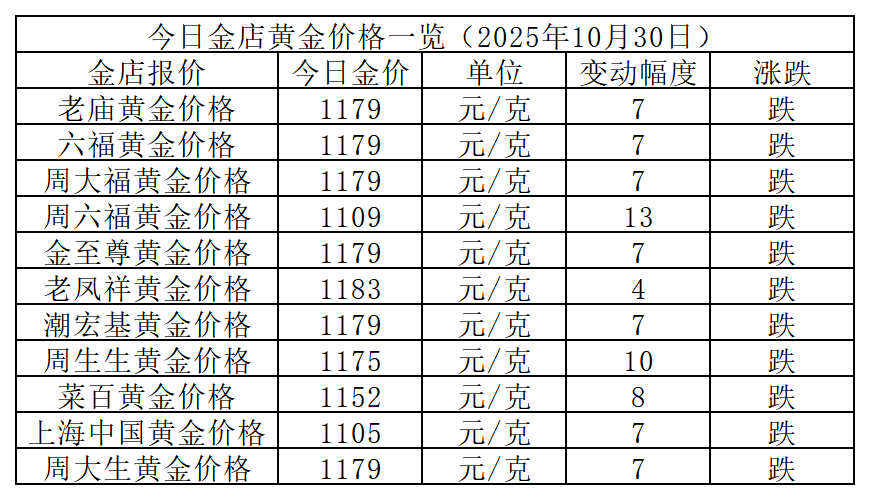 10月30日金价速报,国内金店黄金首饰价格大多下跌7元/克左右,最高达13元/克,虽有回落,但整体无明显变化。今日老凤祥黄金还是报价最高的金店,仅下跌4元/克,报1183元/克;上海中国黄金下跌7元/克,报1105元/克,稳定保持最低价金店。今日黄金高低价差有所扩大,为78元/克。