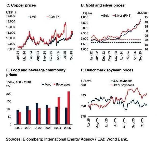 粮食价格同样呈现跌势,预计2025年下降6.1%,2026年微降0.3%。受产量创纪录及贸易紧张局势影响,2025年大豆价格承压下行,但未来两年有望逐步趋稳。与此同时,随着供应状况改善,咖啡与可可价格预计2026年将有所回落。