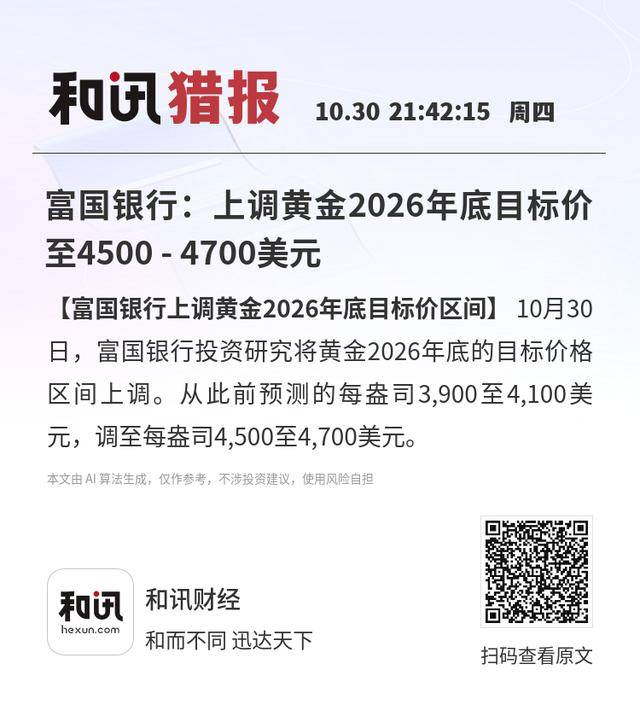 【富国银行上调黄金2026年底目标价区间】10月30日,富国银行投资研究将黄金2026年底的目标价格区间上调。从此前预测的每盎司3,900至4,100美元,调至每盎司4,500至4,700美元。