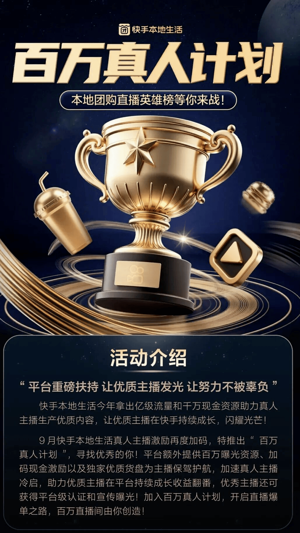 今年 9 月,快手还启动本地生活“百万真人计划”,面向真人主播达人推出新一轮流量与现金扶持政策,通过流量现金资源等多重平台支持,帮助优质主播突破冷启动瓶颈、实现稳定成长。