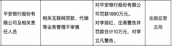 10月31日,金融监管总局披露的罚单显示,平安银行股份有限公司及相关责任人员因相关互联网贷款、代销等业务管理不审慎被罚。金融监管总局对平安银行股份有限公司罚款1880万元,对李丽红、庄燕警告并罚款合计10万元,对李立凡警告。