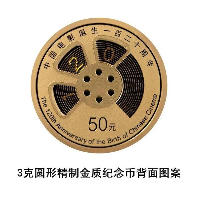 3克圆形金质纪念币背面图案由胶片放映盘装饰造型、数字“120”等元素组合设计而成,并刊“中国电影诞生一百二十周年”中文字样、“The 120th Anniversary of the Birth of Chinese Cinema”英文字样及面额。