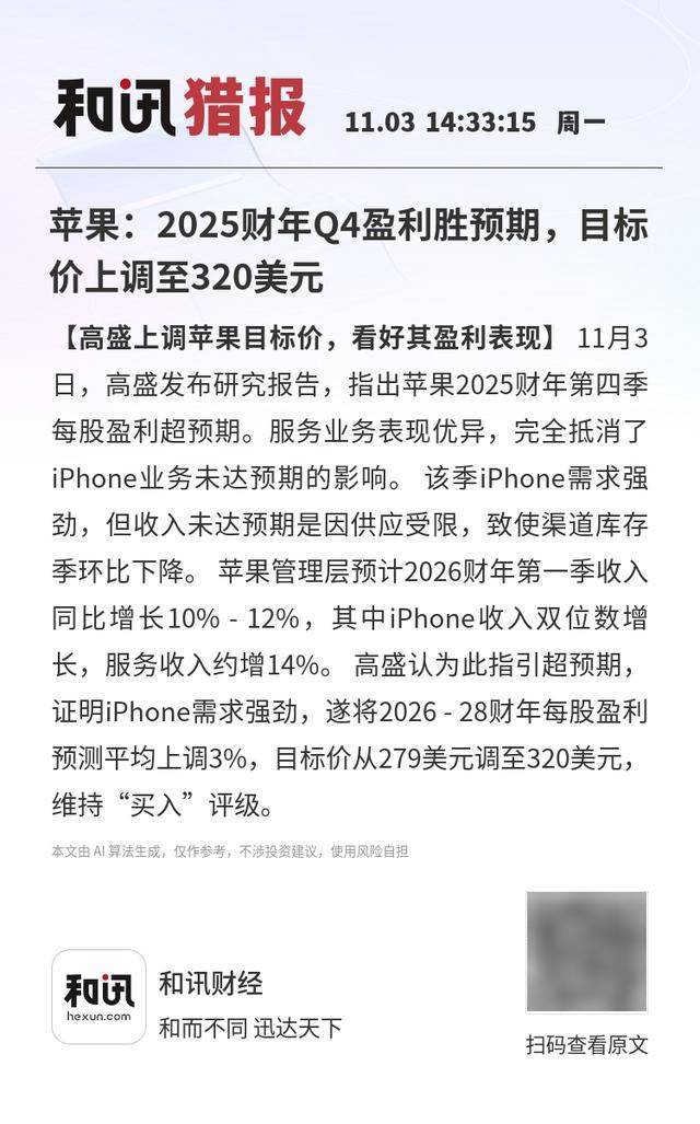 【高盛上调苹果目标价,看好其盈利表现】11月3日,高盛发布研究报告,指出苹果2025财年第四季每股盈利超预期。服务业务表现优异,完全抵消了iPhone业务未达预期的影响。 该季iPhone需求强劲,但收入未达预期是因供应受限,致使渠道库存季环比下降。 苹果管理层预计2026财年第一季收入同比增长10% - 12%,其中iPhone收入双位数增长,服务收入约增14%。 高盛认为此指引超预期,证明iPhone需求强劲,遂将2026 - 28财年每股盈利预测平均上调3%,目标价从279美元调至320美元,维持“买入”评级。