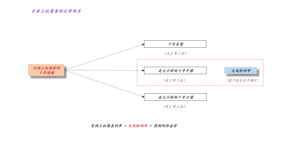 如上图所示,不同主权国家的十年期主权债务是联合定价的。大家先基于实力等综合因素决定该期限的国际无风险利率,其他主权国家在无风险利率的基础上增加国别风险溢价。于是,就有了下面的通用公式: