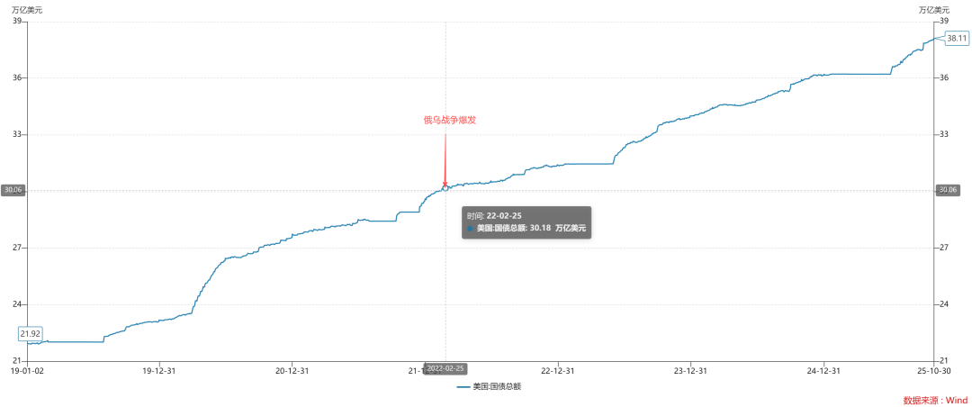 如上图所示,俄乌战争爆发之后,美国国债余额又增加了8万亿美金。它蚕食了美债的信用基础,极大地改变了美债的定价逻辑。