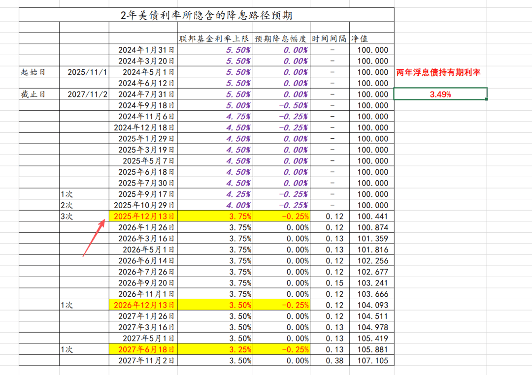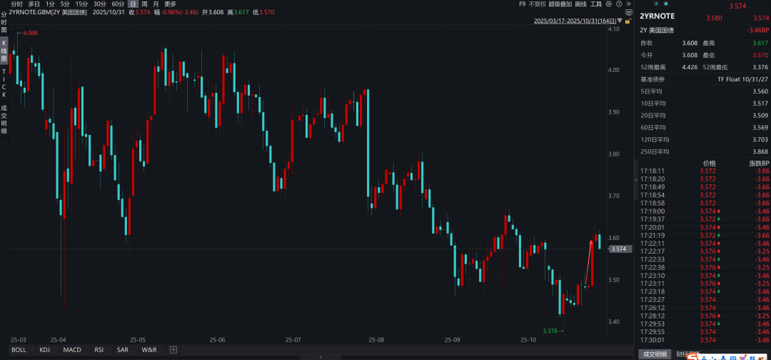 如上图所示,如果12月份降息25bp的概率是100%,那么,两年美债的利率应该在3.49%附近。新闻发布会落地之后,两年美债利率上升到了3.60%附近,这说明,市场认为12月份降息的概率只剩下50%。