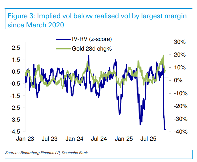 尽管抛售减弱是积极信号,但报告也发出了一项短期风险提示。目前,黄金的1个月已实现波动率(realised vol)远高于隐含波动率(implied vol),二者之间的差距达到了自2020年3月以来的最大值。具体来看,隐含波动率与已实现波动率的差值为-12.6,偏离均值高达4.3个标准差。