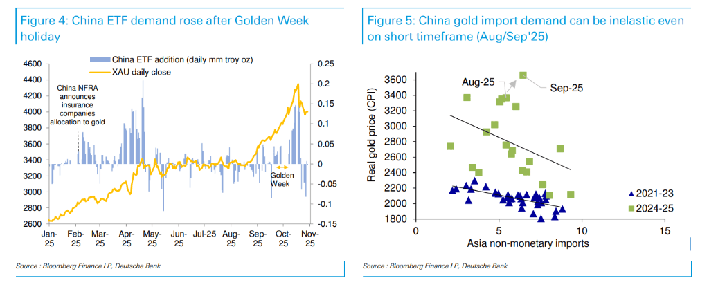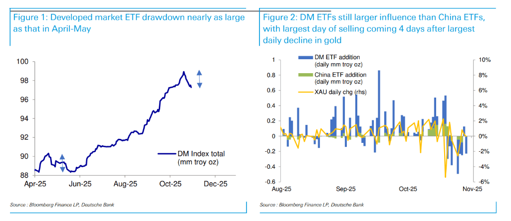 据追风交易台,对于关注黄金市场的投资者而言,德意志银行于2025年11月3日发布的最新报告传递了两个关键信号:第一,近期驱动金价回调的黄金ETF(交易所交易基金)大规模抛售正显现减弱迹象,表明本轮价格修正已接近尾声,而非新一轮下跌的开始。第二,备受关注的中国黄金增值税(VAT)规则调整,预计对中国黄金需求和进口的整体影响温和且有限。