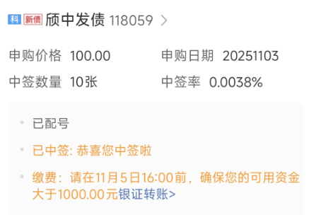 11月5日,可转债打新市场公布颀中科技(688352)发行的可转债——颀中转债的中签结果。此次中签号码共有33.66万个,每个中签号码只能认购1手(1000元)颀中转债。