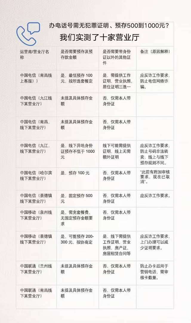 此外,记者了解到,即便是本地户籍,在江西部分地方运营商营业厅办理电话卡,也需要提供工作证明、社保证明、无犯罪记录证明、银行流水等其中之一,只是预存的电话费没有那么高。