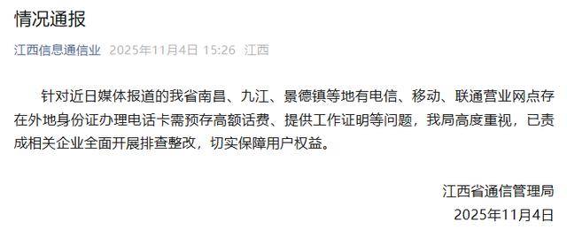 11月4日,江西省通信管理局发布情况通报称,针对近日媒体报道的江西省南昌、九江、景德镇等地有电信、移动、联通营业网点存在外地身份证办理电话卡需预存高额话费、提供工作证明等问题,江西省通信管理局高度重视,已责成相关企业全面开展排查整改,切实保障用户权益。