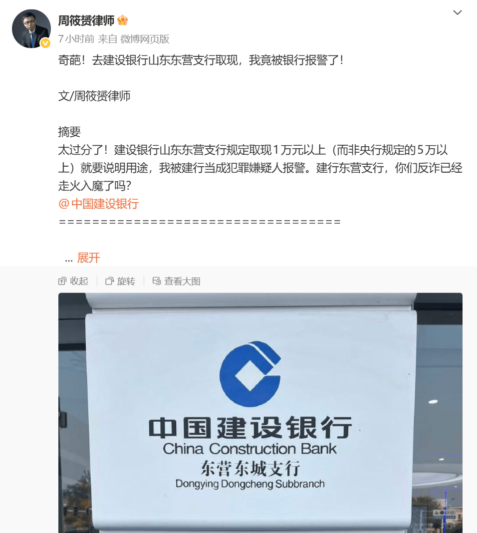 11月5日,微博百万粉丝大V、专职律师周筱赟发文爆料,称其在建设银行(601939)山东东营东城支行取现(金额低于5万元)时,因未“积极配合”说明取现用途及账户资金往来,被银行以反诈名义当成犯罪嫌疑人“报警”(要求反诈中心出警核实)。