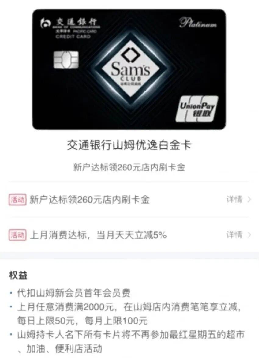 比如在民生银行之前,交通银行曾与山姆联名推出信用卡,不仅免除了首年普通会员年费,每月还有消费满减可领取。