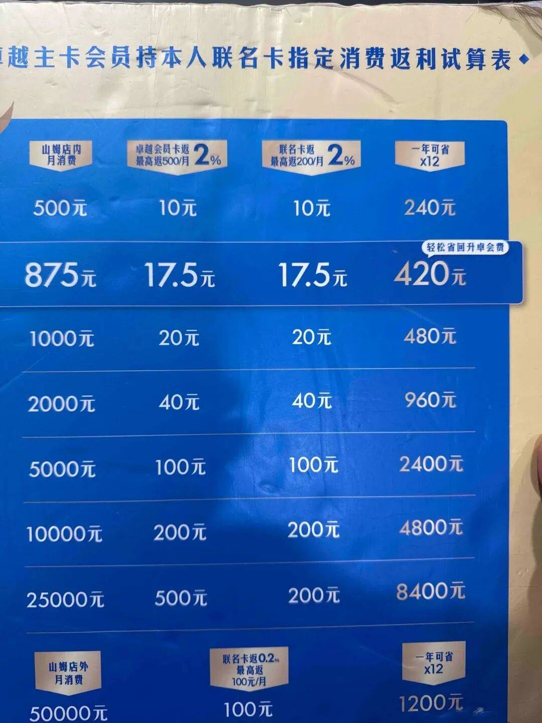 这是因为,山姆普通会员年费260元,卓越卡会员年费680元,民生山姆联名信用卡主,每月在山姆消费至少875元,才能让这420元的差价回本。