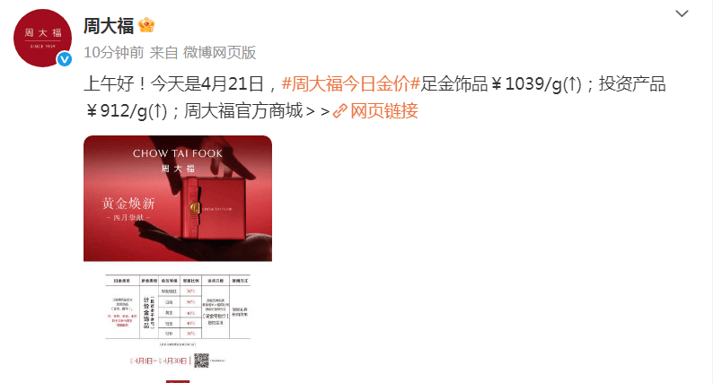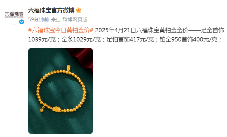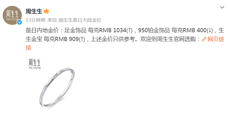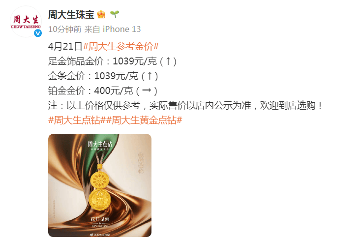 在零售端,今日周大福、六福珠宝、周大生的首饰金价均为1039元/克,周生生的首饰金价为1034元/克。