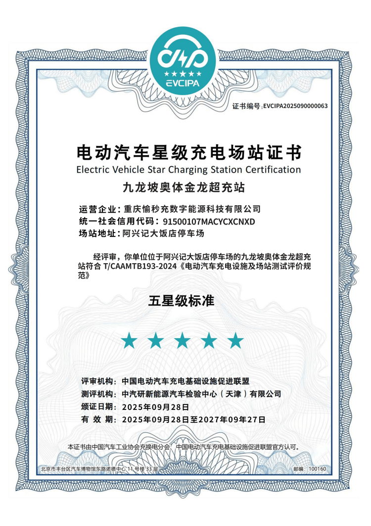 中国电动汽车充电基础设施促进联盟授予愉秒充奥体金龙旗舰超充站“五星级场站”证书,另外,愉秒充还荣获5座“五星级标准”认证以及10座“四星级标准”认证的超充站,充分彰显了愉秒充在充电场站建设与服务体系上的领先实力,也激励着愉秒充公司持续引领行业高标准,推动产业迈向更高水平。