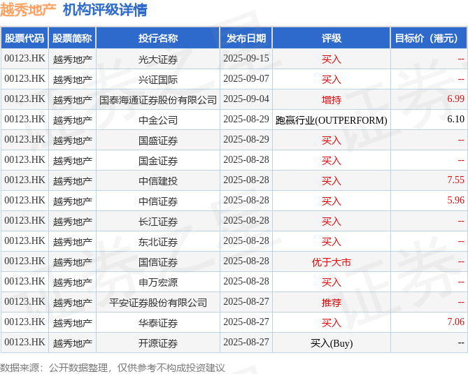 截至2025年11月6日收盘,越秀地产(00123.HK)报收于4.5港元,上涨0.45%,成交量341.61万股,成交额1531.16万港元。投行对该股的评级以买入为主,近90天内共有10家投行给出买入评级,近90天的目标均价为6.73港元。光大证券最新一份研报给予越秀地产买入评级。