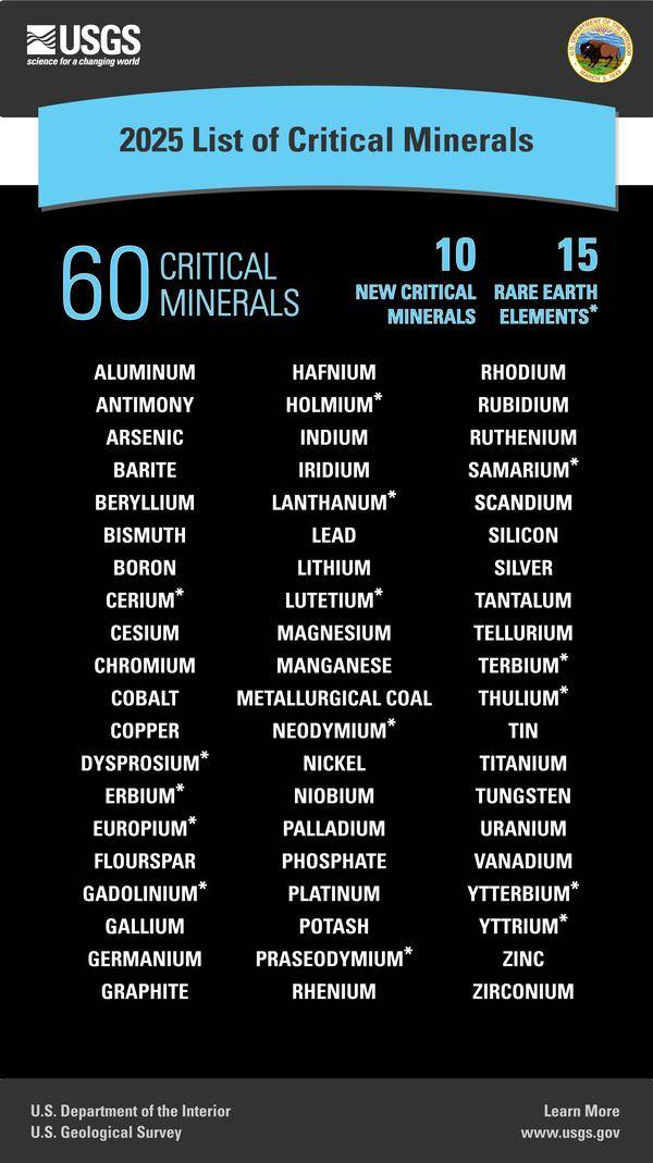 此次,USGS更新后的清单新增了10种矿产,使总数达到60种,该清单还包括15种稀土元素。稀土是汽车和飞机等产品中磁铁的主要原料。
