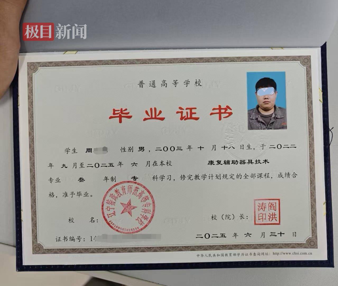 如今,周同学只有学校颁发的电子版毕业证,但没有收到纸质版毕业证书。11月7日,极目新闻记者联系辽宁特殊教育师范高等专科学校,工作人员表示,今年毕业季,周同学因距离较远没有返校领取毕业证书,但不存在挂科、未完成学业的情况,之后学校会根据其快递地址安排邮寄。