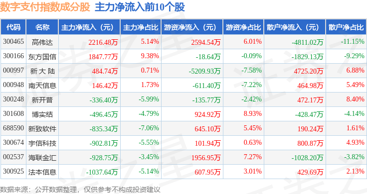 资金流向方面,数字支付(980113)指数成份股当日主力资金净流出合计28.18亿元,游资资金净流入合计6.51亿元,散户资金净流入合计21.66亿元。成份股资金流向详情见下表: