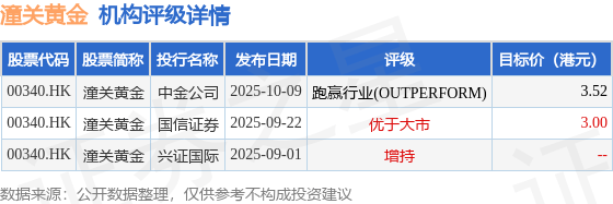 截至2025年11月7日收盘,潼关黄金(00340.HK)报收于2.72港元,上涨0.74%,成交量1379.21万股,成交额3764.18万港元。投行对该股的评级以跑赢行业(OUTPERFORM)为主,近90天内共有1家投行给出跑赢行业(OUTPERFORM)评级,近90天的目标均价为3.26港元。中金公司最新一份研报给予潼关黄金跑赢行业(OUTPERFORM)评级,目标价3.52港元。