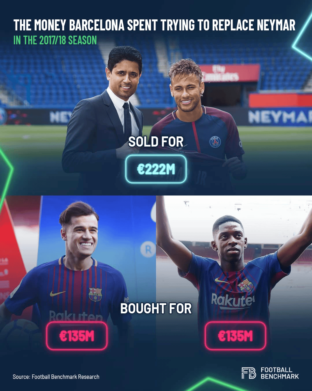登贝莱、库蒂尼奥、格列兹曼等高价引援接踵而至,但都表现不佳,最终骨折出售,再加上梅西那份四年高达5亿欧元的续约合同。