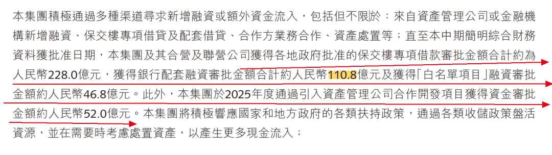 截至2025年中期末,融创获得保交楼专项借款审批金额合计约为228亿元、银行配套融资审批金额合计约110.8亿元、「白名单项目」融资审批金额约46.8亿元。