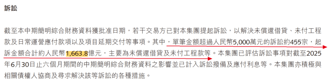 不止如此,融创还面临诸多诉讼。截至2025年中期末,诉讼单笔金额超过5000万元的诉讼455宗,起诉金额合计约1663.8亿元,主要为未偿还借贷及未付工程款等。