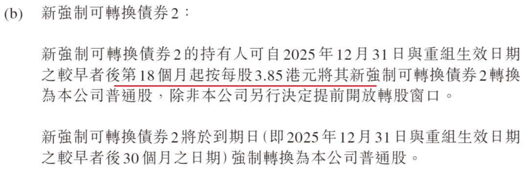 或者,债权人可自2025年12月31日与重组生效日期之较早者后第18个月起,按每股3.85港元的价格,将其新强制可转换债券转换为公司普通股。