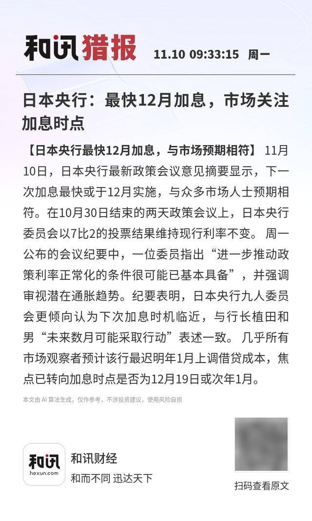 【日本央行最快12月加息,与市场预期相符】11月10日,日本央行最新政策会议意见摘要显示,下一次加息最快或于12月实施,与众多市场人士预期相符。在10月30日结束的两天政策会议上,日本央行委员会以7比2的投票结果维持现行利率不变。 周一公布的会议纪要中,一位委员指出“进一步推动政策利率正常化的条件很可能已基本具备”,并强调审视潜在通胀趋势。纪要表明,日本央行九人委员会更倾向认为下次加息时机临近,与行长植田和男“未来数月可能采取行动”表述一致。 几乎所有市场观察者预计该行最迟明年1月上调借贷成本,焦点已转向加息时点是否为12月19日或次年1月。