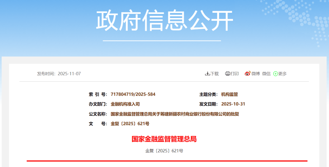 11月7日,国家金融监督管理总局官网发布的消息显示,新疆农村商业银行股份有限公司(以下简称新疆农商银行)已于10月31日获批筹建。全文如下: