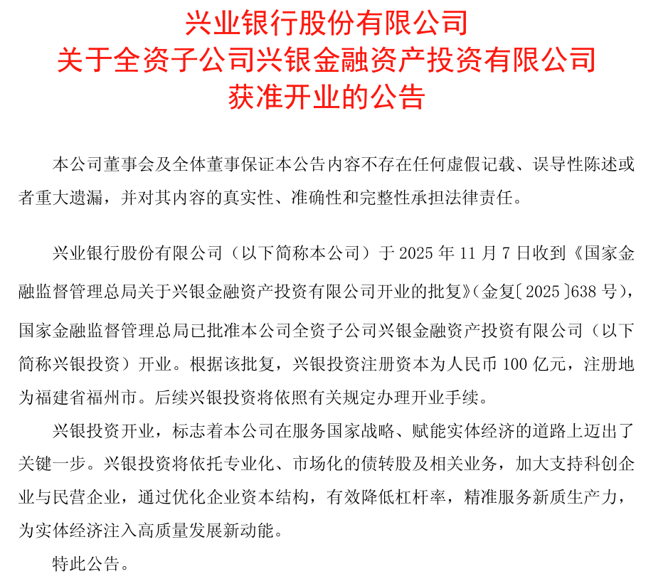 11月9日,兴业银行(601166)发布公告,披露其全资子公司兴银金融资产投资有限公司(下称“兴银投资”)已收到国家金融监督管理总局《关于兴银金融资产投资有限公司开业的批复》,获准正式开业。