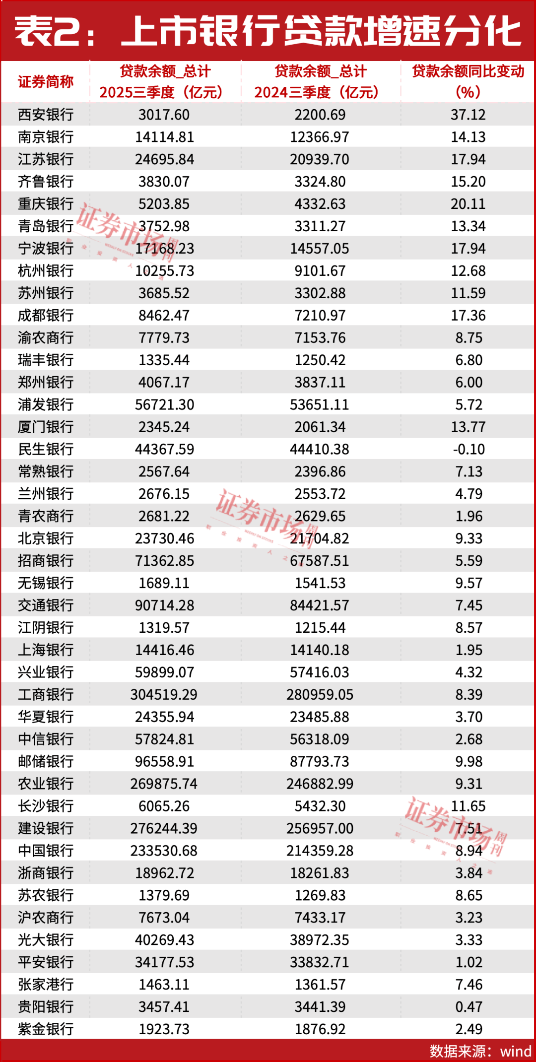 本刊根据Wind数据统计,截至三季度,A股42家上市银行中共有12家银行三季度贷款总额同比出现2位数增幅。其中西安银行、重庆银行、江苏银行、宁波银行、成都银行和齐鲁银行同比增幅超过15%,分别为37.12%、20.11%、17.94%、17.94%、17.36%和15.2%。(见表2)