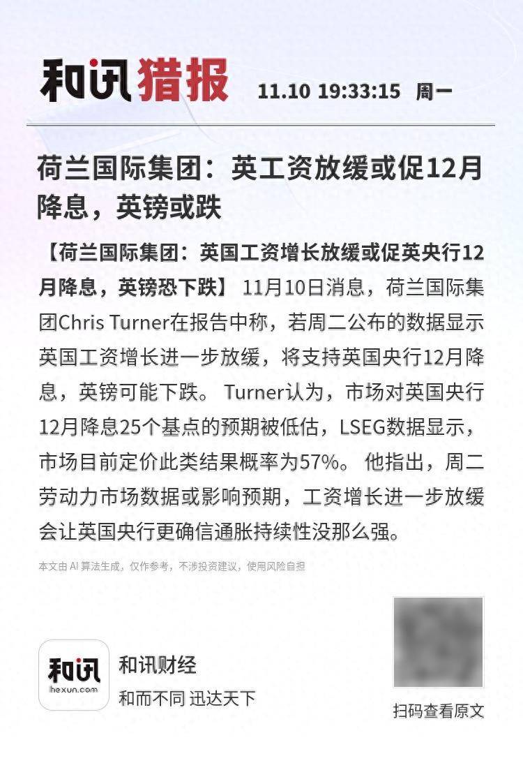 【荷兰国际集团:英国工资增长放缓或促英央行12月降息,英镑恐下跌】11月10日消息,荷兰国际集团Chris Turner在报告中称,若周二公布的数据显示英国工资增长进一步放缓,将支持英国央行12月降息,英镑可能下跌。 Turner认为,市场对英国央行12月降息25个基点的预期被低估,LSEG数据显示,市场目前定价此类结果概率为57%。 他指出,周二劳动力市场数据或影响预期,工资增长进一步放缓会让英国央行更确信通胀持续性没那么强。