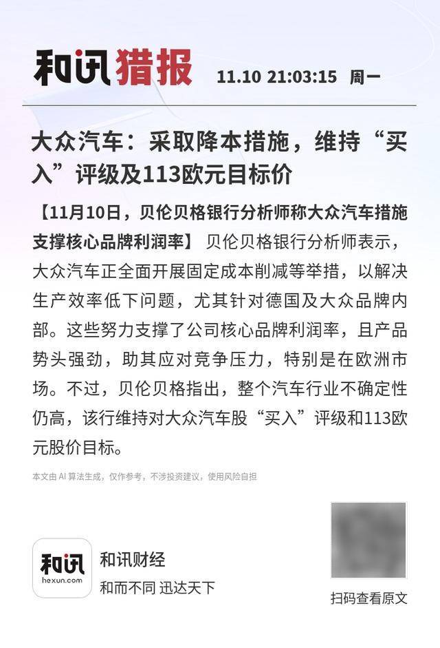【11月10日,贝伦贝格银行分析师称大众汽车措施支撑核心品牌利润率】贝伦贝格银行分析师表示,大众汽车正全面开展固定成本削减等举措,以解决生产效率低下问题,尤其针对德国及大众品牌内部。这些努力支撑了公司核心品牌利润率,且产品势头强劲,助其应对竞争压力,特别是在欧洲市场。不过,贝伦贝格指出,整个汽车行业不确定性仍高,该行维持对大众汽车股“买入”评级和113欧元股价目标。