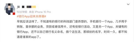 对于银行密集关停整合App的操作,网友们纷纷表示支持。有的直言“早该这样了”,有的认为“每个银行有一个App就行了”。
