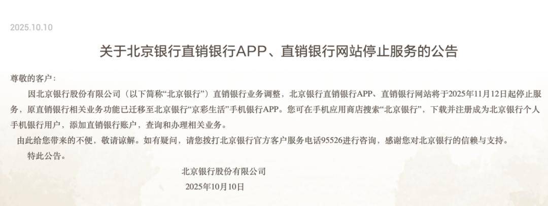 10月上旬,北京银行发布公告称,因直销银行业务调整,北京银行直销银行App、直销银行网站将于2025年11月12日起停止服务,原直销银行相关业务功能已迁移至北京银行“京彩生活”手机银行App。