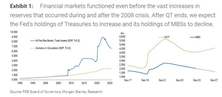 这一操作的本质是资产互换,而非新增储备。摩根士丹利首席全球经济学家Seth B Carpenter在报告中强调,这一操作的核心是改变资产负债表的“构成”,而非扩大其“规模”。通过向市场释放MBS所附带的久期和凸性风险,同时购入短债,美联储并未实质性地放松金融条件。