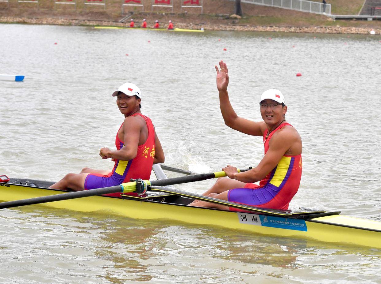 和在前一天夺冠的河南女子四人双桨组合相同,崔兵辉和边世豪这对组合在此前的预赛和半决赛中,也都是连续排名第一。而和前者都是最后阶段逆袭成功不同的是,后者的表现相当强势,都是一路领先,率先撞线。因此,男子双人单桨这个项目,也在赛前被河南代表团认为更有把握。