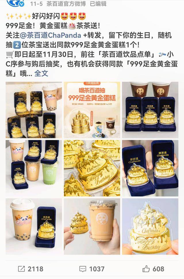 “冬天的第一杯黄金奶茶”悄然兴起,成为不少年轻人的入冬“仪式感”。记者在小红书搜索发现,“茶饮”+“黄金“联名相关的笔记数量庞大,已成为显著的社交趋势。11月7日,茶百道微博官方账号推出的“奶茶淘金”,消费者参与抽奖即有机会得黄金蛋糕造型的小金片活动,火热“出圈儿”。