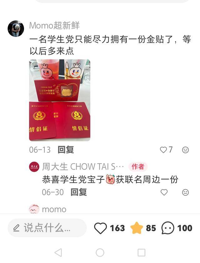 “一名学生党只能尽力拥有一份金贴了”,周大生小红书笔记置顶了一条消费者的热门评论,并暖心互动道“恭喜学生党宝子获联名周边一份”。在蜜雪冰城下单有机会抽到周大生定制的黄金情侣证、包含重量0.5克的雪王造型足金挂坠。