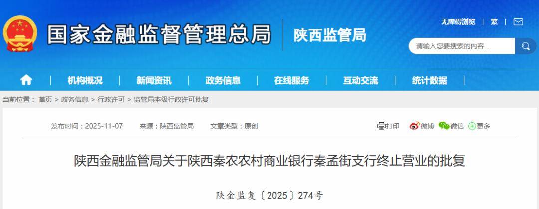 《陕西秦农农村商业银行股份有限公司关于秦孟街支行终止营业的请示》(秦农银字〔2025〕174号)收悉。经审核,现批复如下: