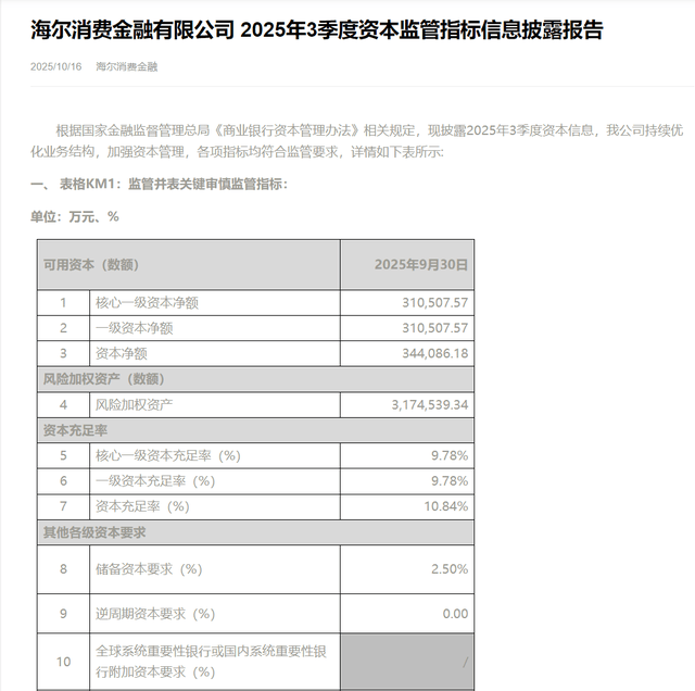 海尔消费金融官网发布的2025年3季度资本监管指标披露信息显示:截至本年9月末,其资本净额为34.41亿元,核心一级资本充足率为 9.78%,一级资本充足率9.78%,资本充足率为 10.84%。
