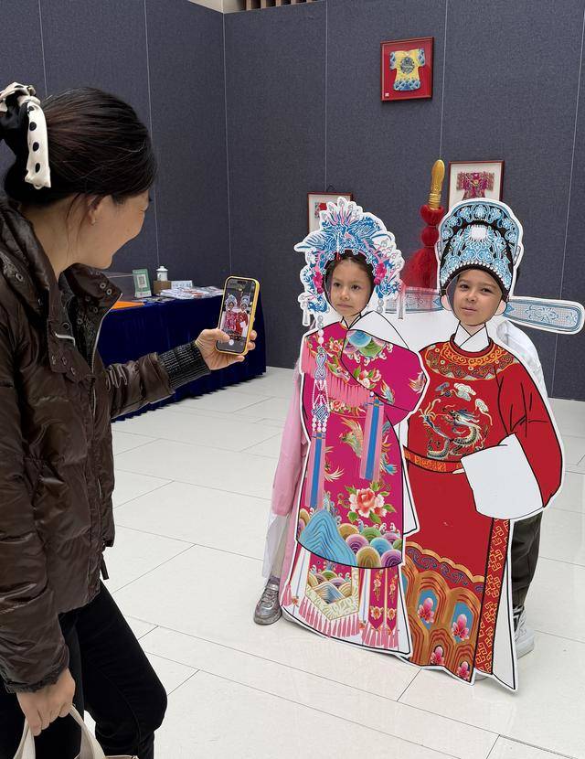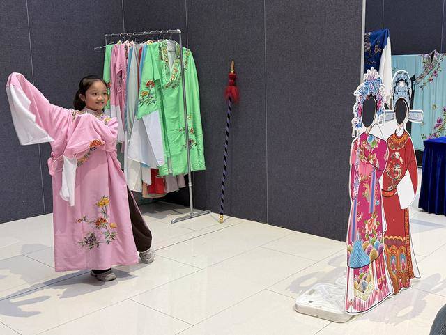孩子们更像来到了欢乐的海洋,沉浸在传统戏曲带给他们的乐趣之中,他们纷纷打卡戏曲人物塑像,小生、花旦,忙得不亦乐乎。展馆一旁,摆放着越剧舞台常用的刀、枪等道具,孩子们忍不住拿起来舞弄一番。虽然初次尝试,却也有模有样,令人忍俊不禁。当看到盔帽和戏服,孩子们更是显得爱不释手。他们争先恐后但也井然有序地穿上戏服、戴上盔帽,俨然一个个少儿版的才子与佳人。
