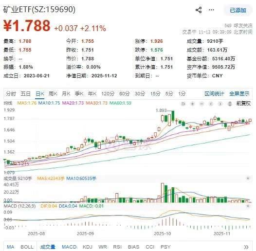11月13日,有色矿业板块盘初放量冲高。截至9时39分,表征板块的矿业ETF(159690)放量涨2.17%,今年以来累计涨85.01%;成分股兴业银锡、白银有色领涨。
