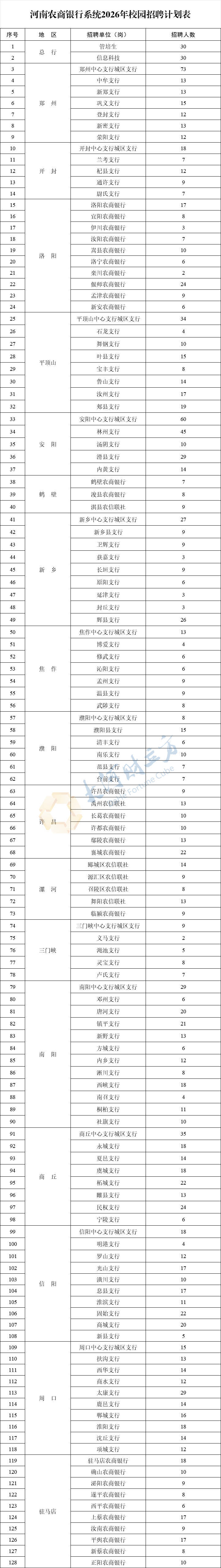 河南农商银行总行招聘管培生30人、信息科技人员30人;市县机构共招聘1676人(具体招聘计划详见附件)。