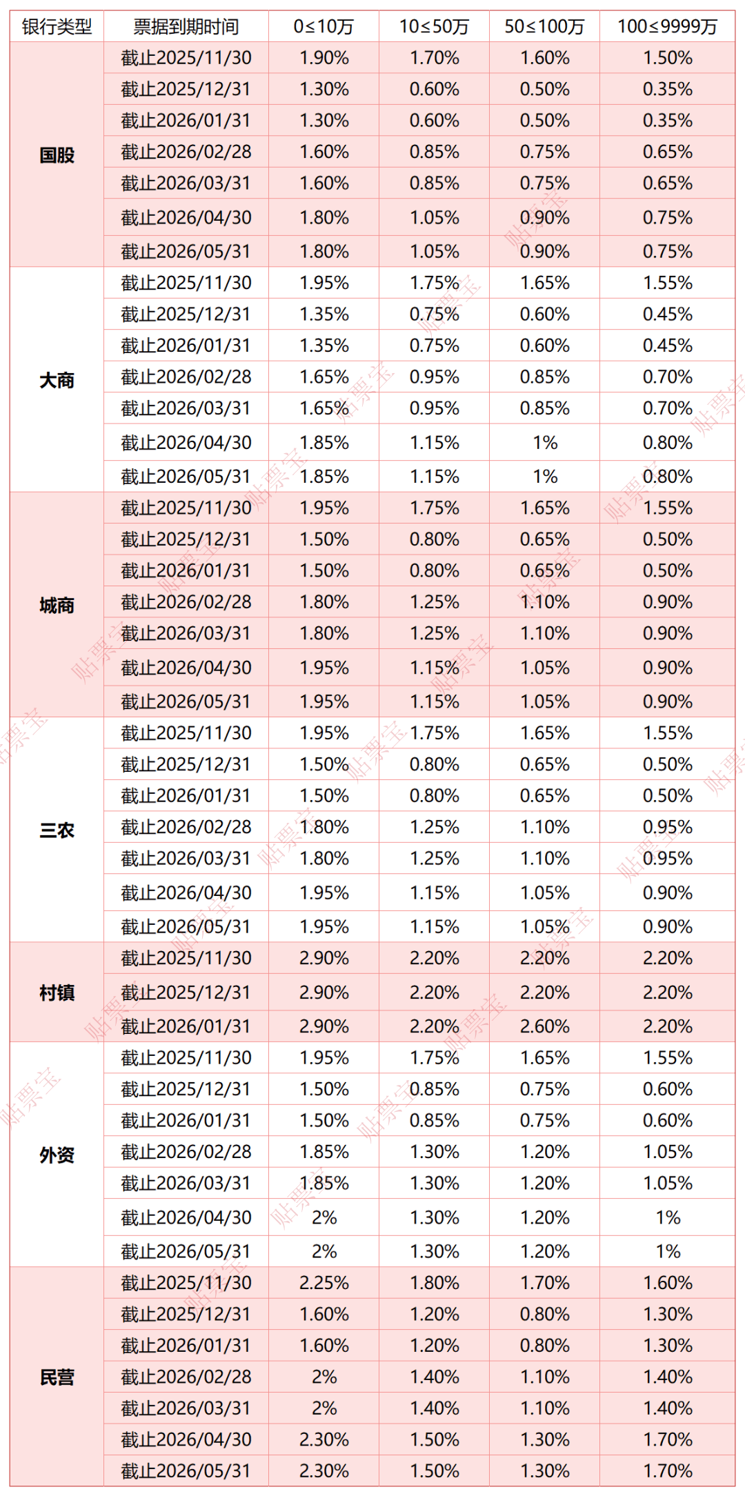 以下为2025年11月13日的银行承兑汇票贴现利率报价表(来源贴票宝):