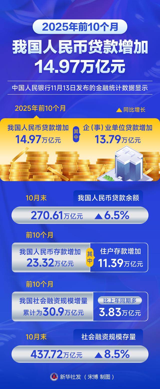 中国人民银行11月13日发布的金融统计数据显示,2025年前10个月我国人民币贷款增加14.97万亿元,其中企(事)业单位贷款增加13.79万亿元。