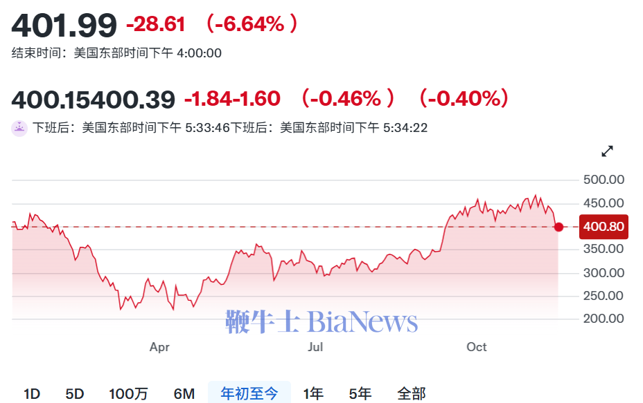 午盘交易期间,特斯拉股价一度跌破 400 美元大关,触及 9 月 15 日以来的最低点。